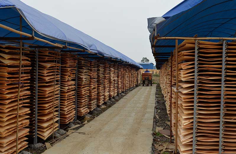 2:裁切和旋切以后的木層都含有比較大的水分,因此,大規模的生產我們要通過木材烘干機進行烘干處理,烘干后的木層比較脆,因此,要自然放置2-3天,可以保證木層的韌性。怪獸木業單板晾曬干燥i,擁有百畝晾曬單板的場地。
